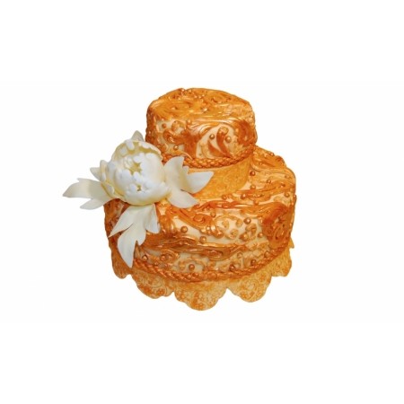 2patrový dort, obalený marcipánem, modelované ornamenty z marcipánu a marcipánový květ.