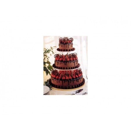 3 patrový čokoládový dort, zdobený čerstvými jahodami.
