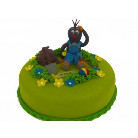 Kulatý dort střední velikosti celý potažený marcipánem, zdobený modelovaným krtečkem.