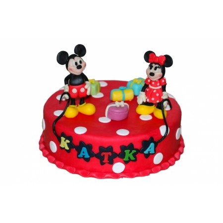 Kulatý dort střední velikosti celý potažený marcipánem, motiv z pohádky Minnie a Mickey, postavičky vymodelované z marcipánu z pohádky Minnie a Mickey.