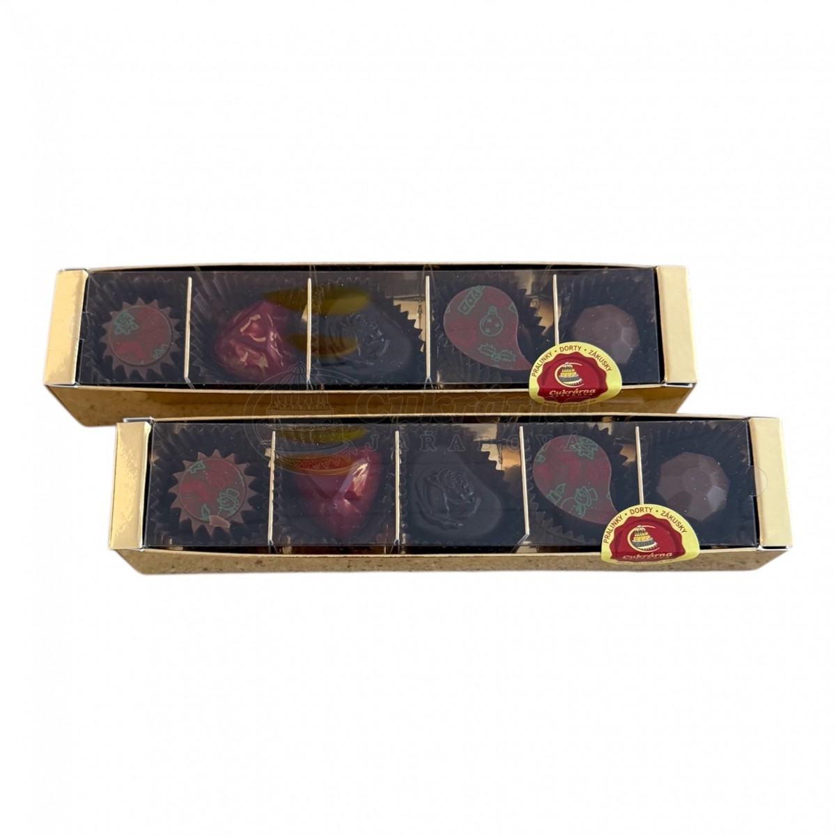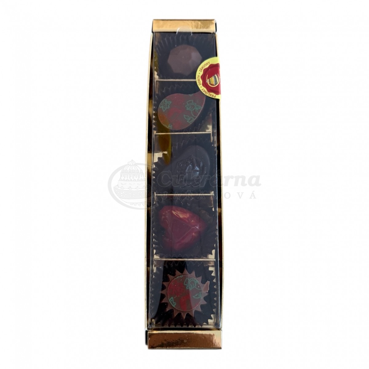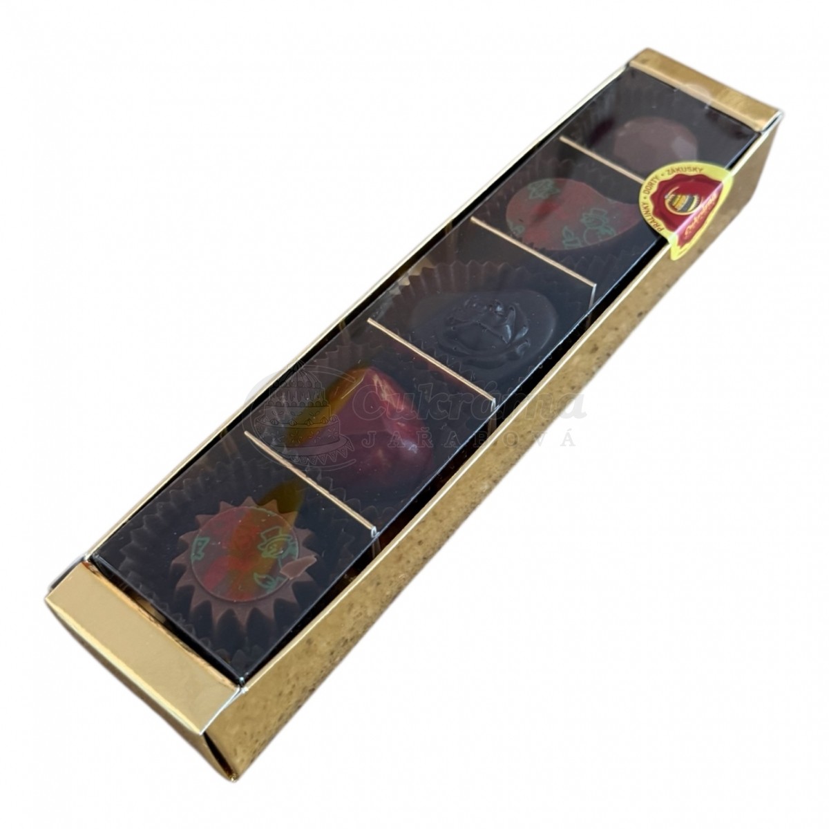 V tomto balení je 5 různých pralinek ve zlaté krabičce.