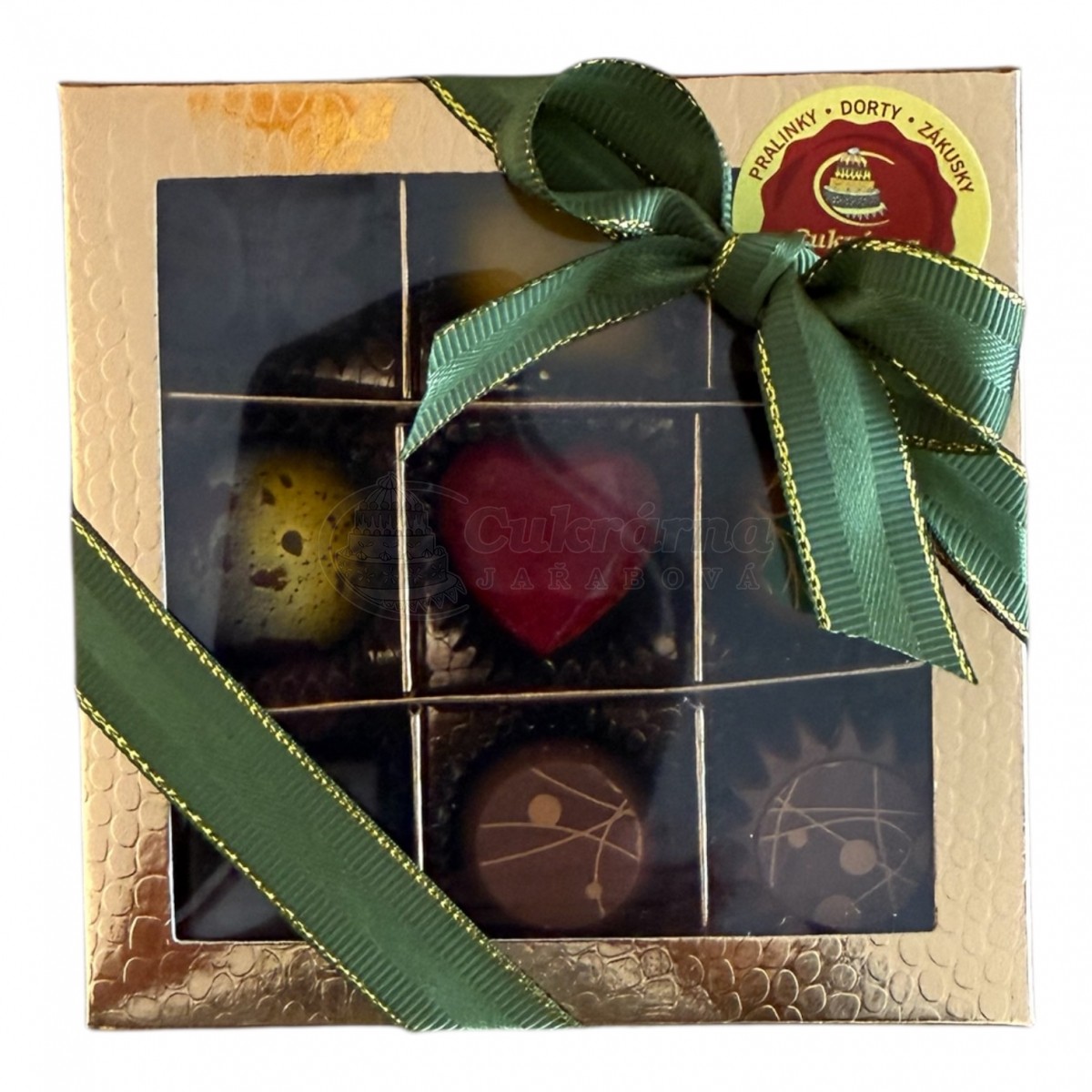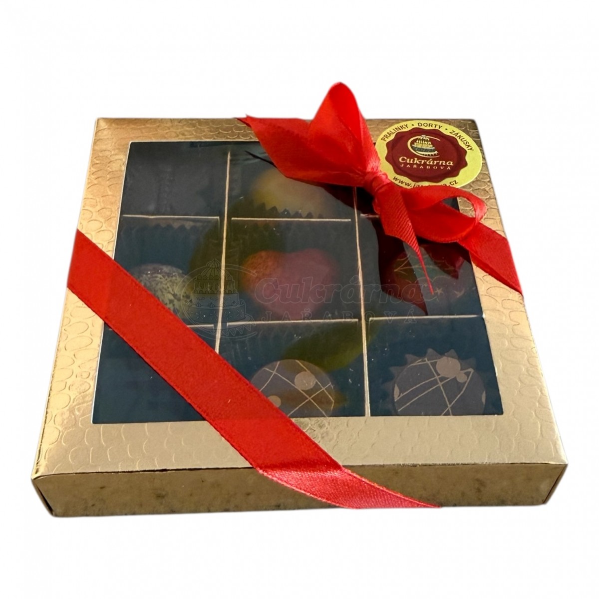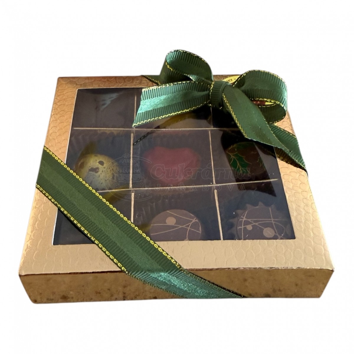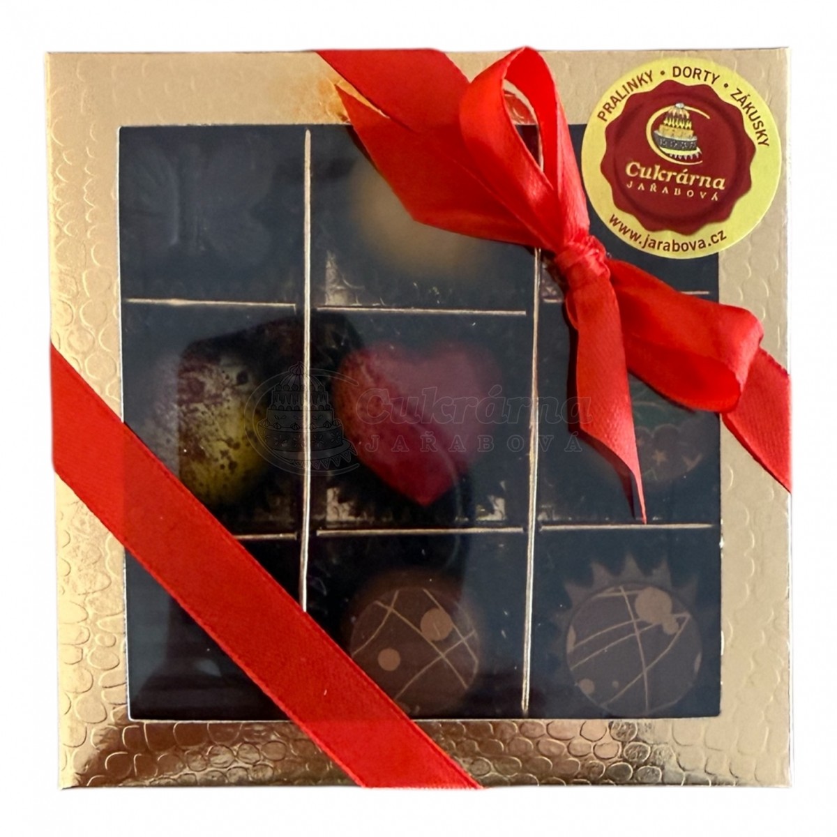 V tomto balení je 9 různých pralinek ve zlaté krabičce převázané stužkou.