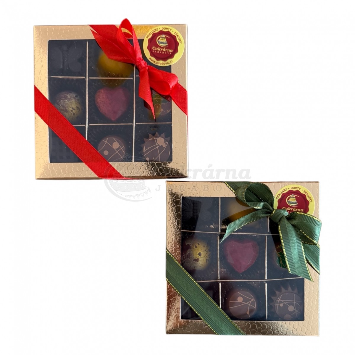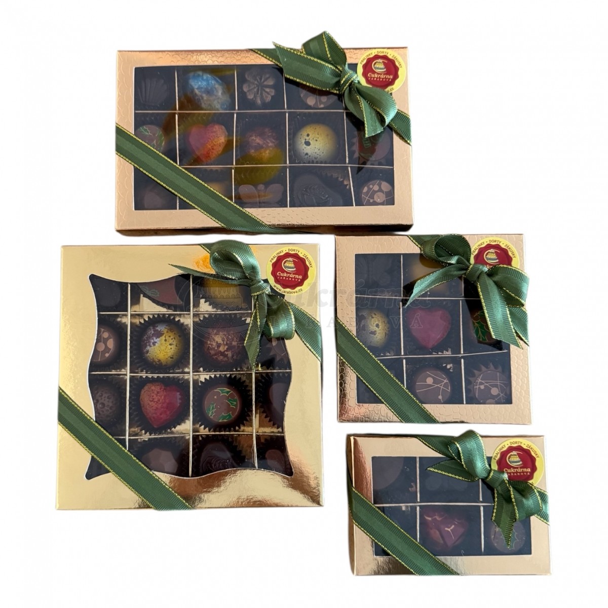 Luxusní ručně vyráběné pralinky v elegantní zlaté bonboniéře z Cukrárny Jařabová.