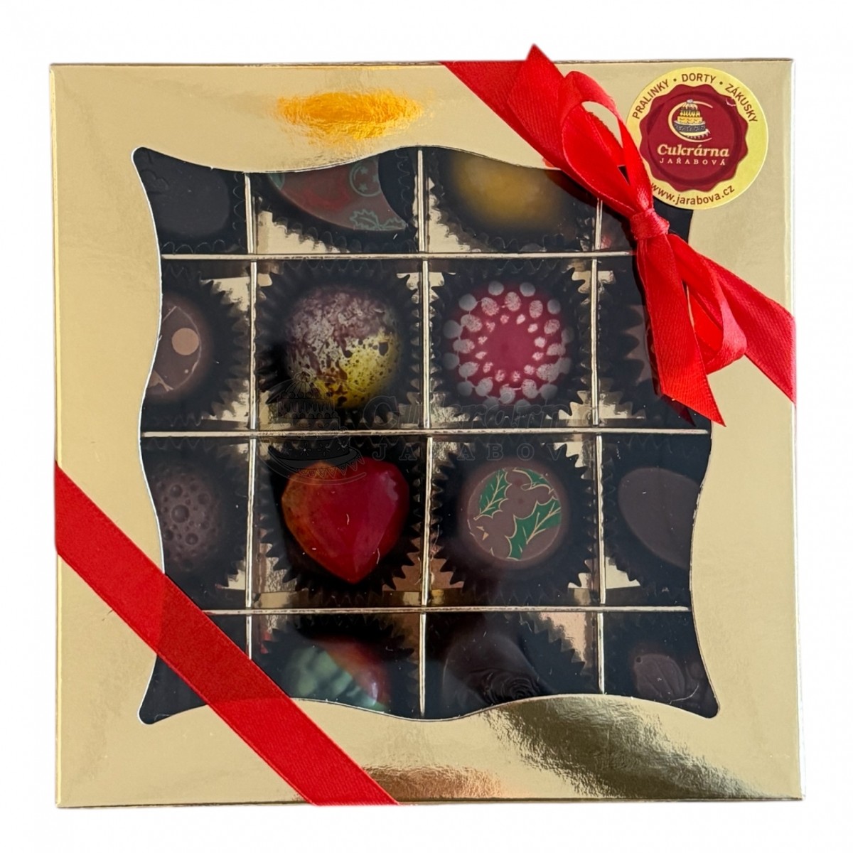 V tomto balení je 16 různých pralinek ve zlaté krabičce převázané stužkou.