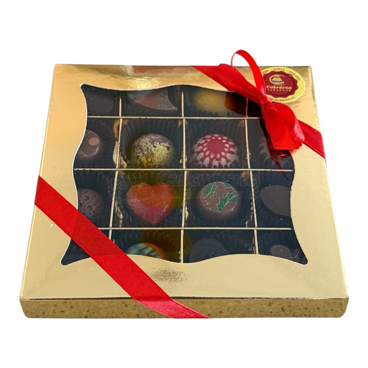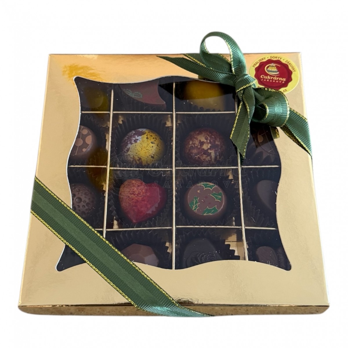Luxusní ručně vyráběné pralinky v elegantní zlaté bonboniéře z Cukrárny Jařabová.