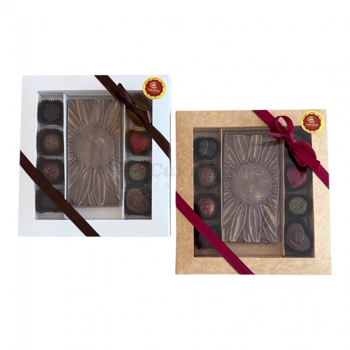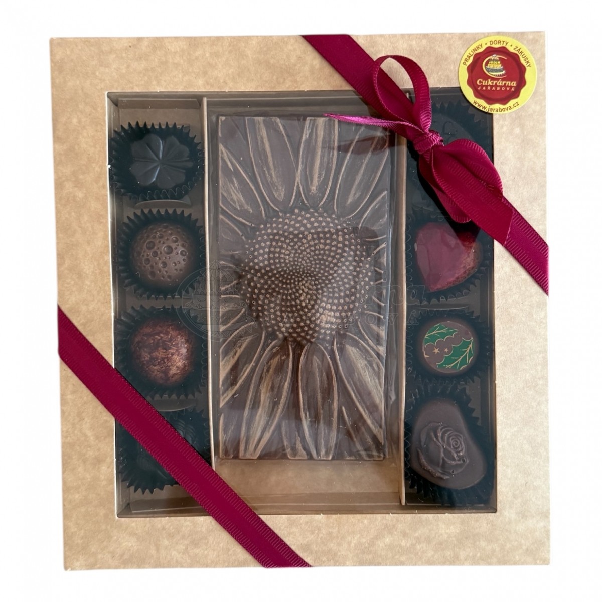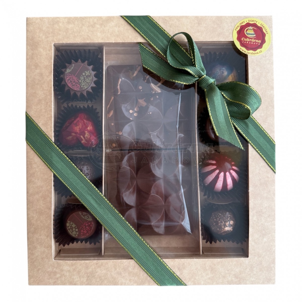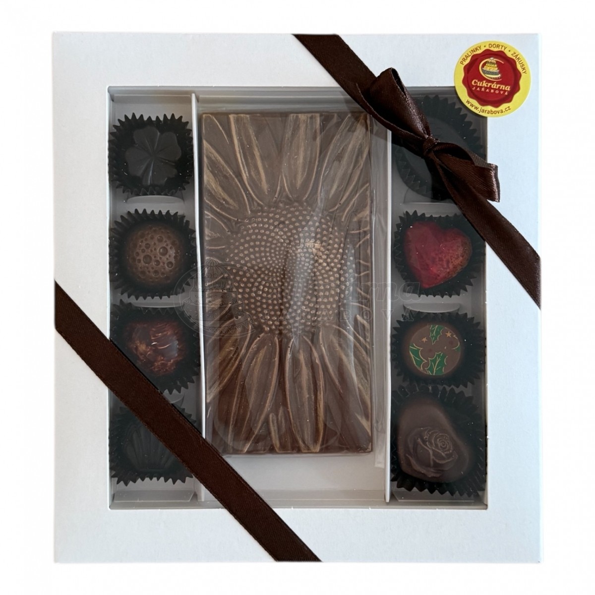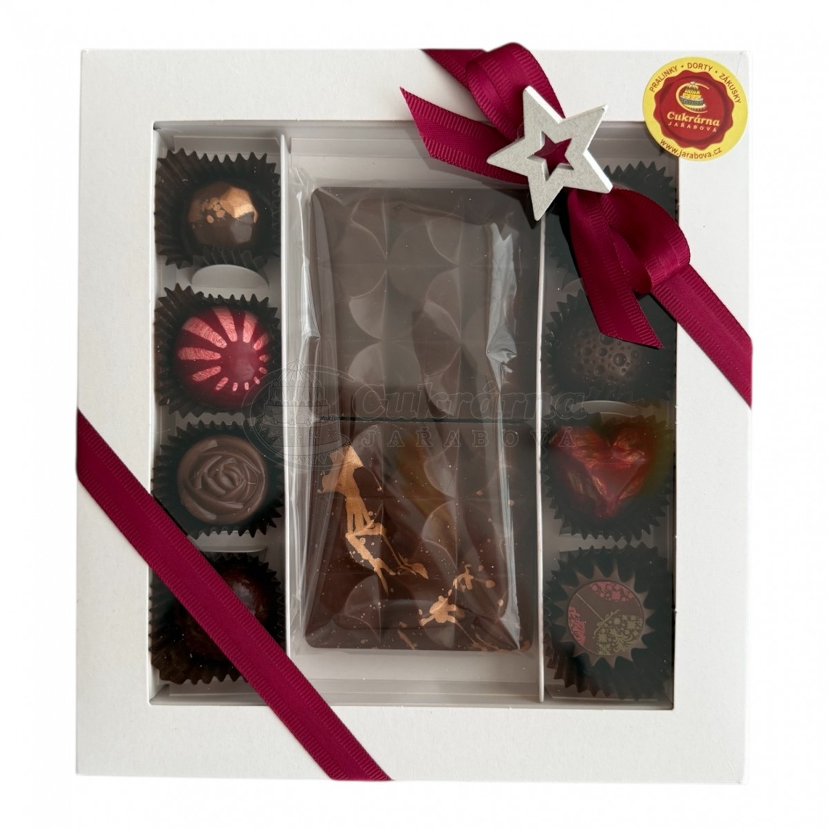 V tomto balení je 8 různých pralinek a čokoláda v krabičce převázané stužkou.