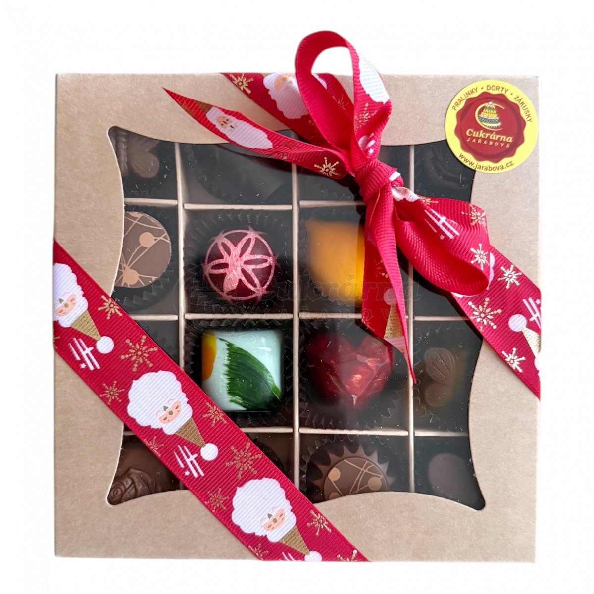 V tomto balení je 16 různých pralinek v krabičce převázané stužkou.