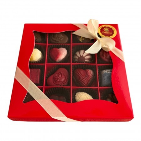V tomto balení je 16 různých pralinek v krabičce převázané stužkou.