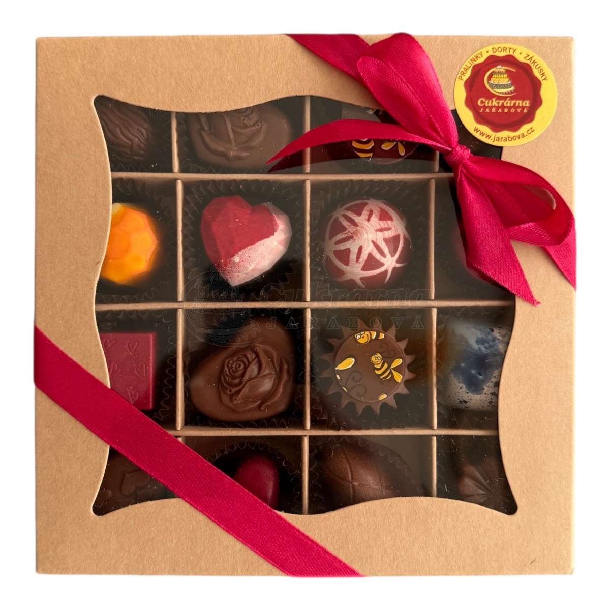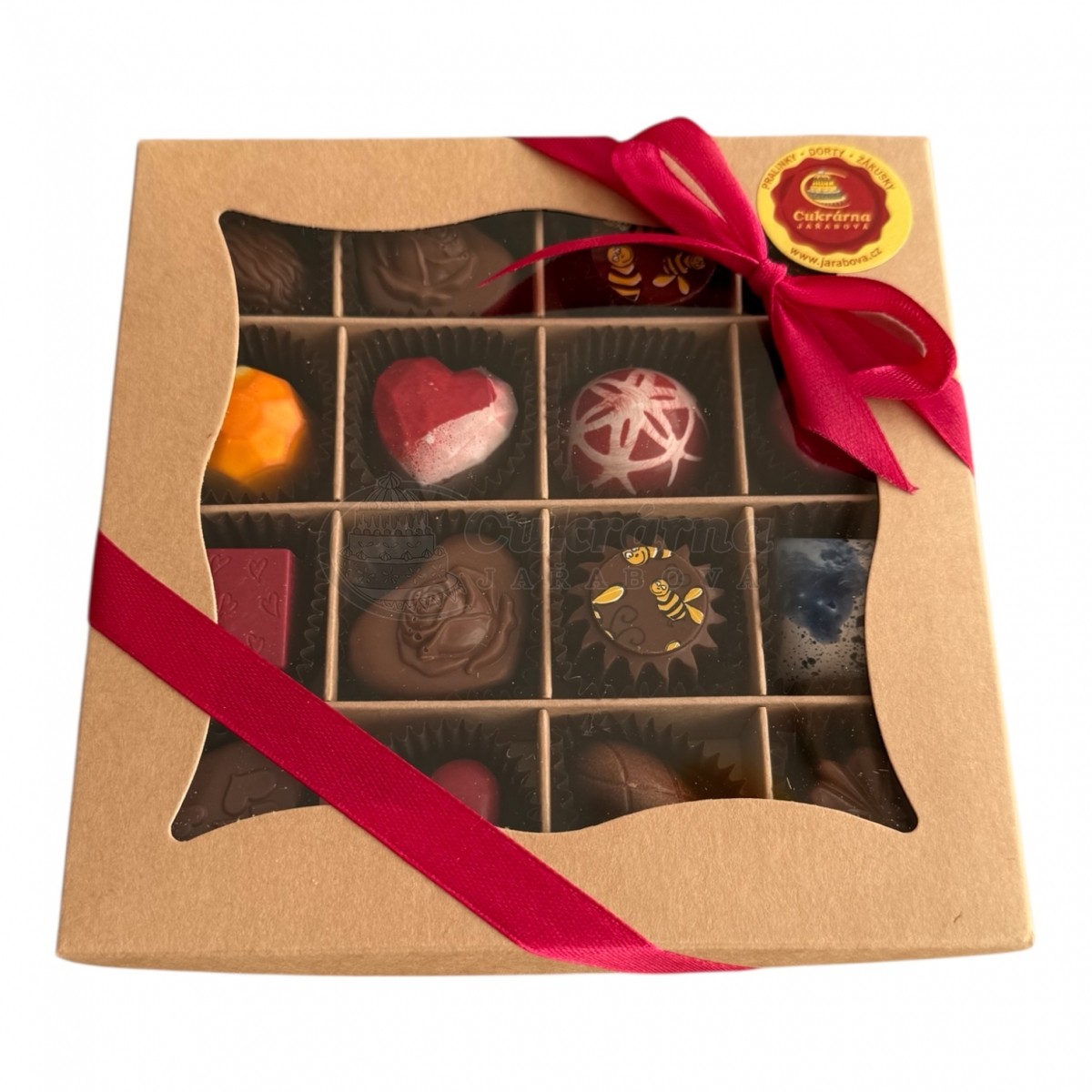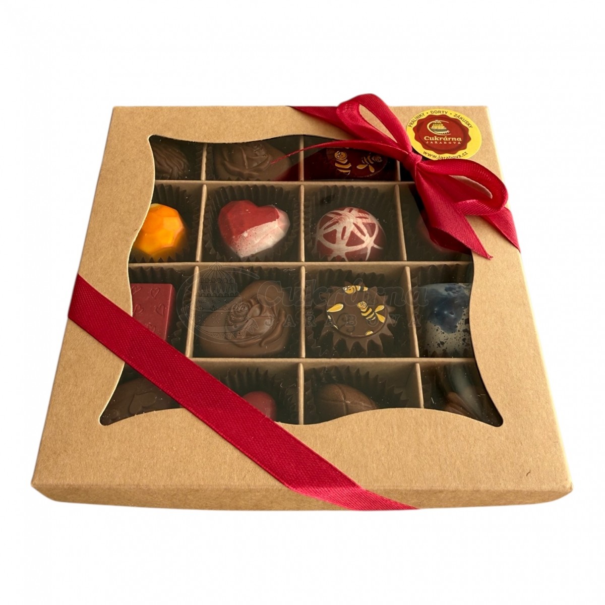 V tomto balení je 16 různých pralinek v krabičce převázané stužkou.