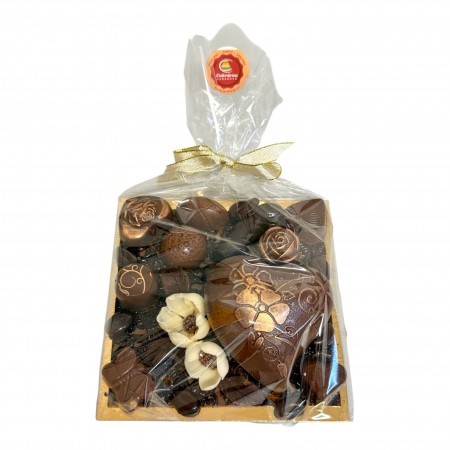 Součástí jsou pralinky s různými příchutěmi a květy z modelovací čokolády, které dodávají výrobku slavnostní a elegantní vzhled.