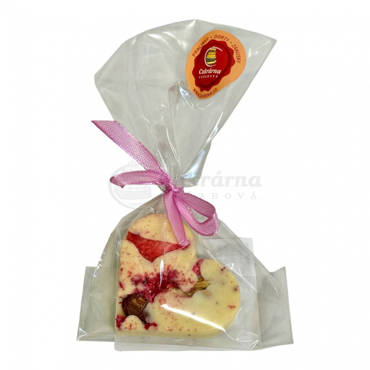 V tomto balení je malé srdíčko z bílé čokolády v sáčku převázané stužkou.