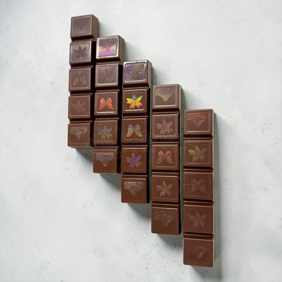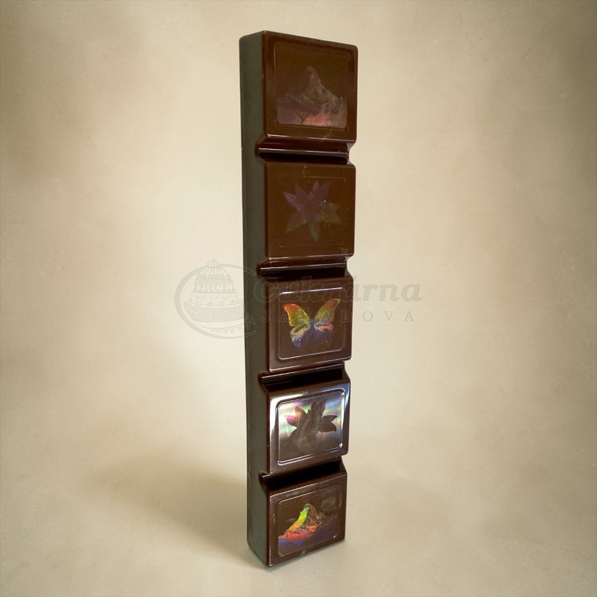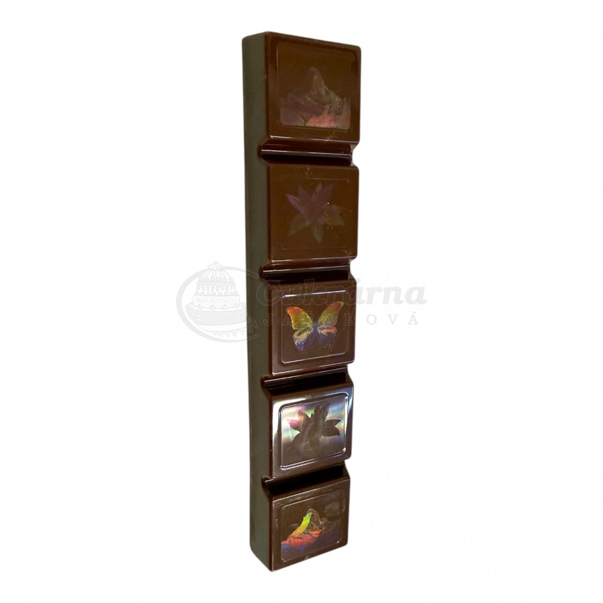 Originální čokoládová tyčinka s jedinečným holografickým efektem na povrchu. Tento úžasný vizuální dojem vzniká díky speciální formě s nanotechnologickou strukturou, která dodává čokoládě luxusní a nevšední vzhled.
