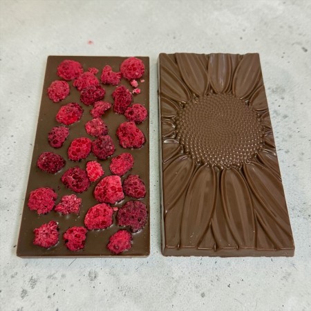 Jemná mléčná čokoláda (43 %) doplněná o křupavé lyofilizované maliny, které si díky šetrnému sušení mrazem zachovávají svou přirozenou chuť, vůni i barvu.