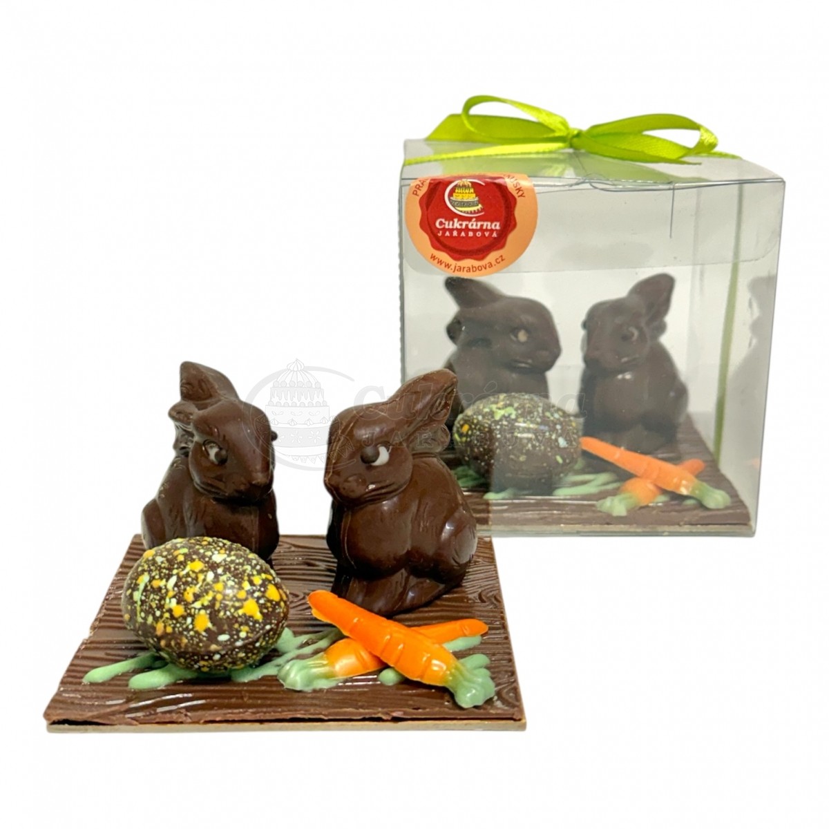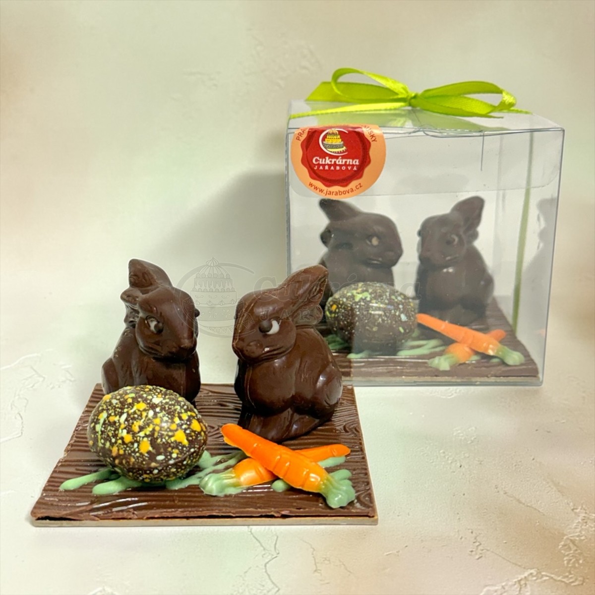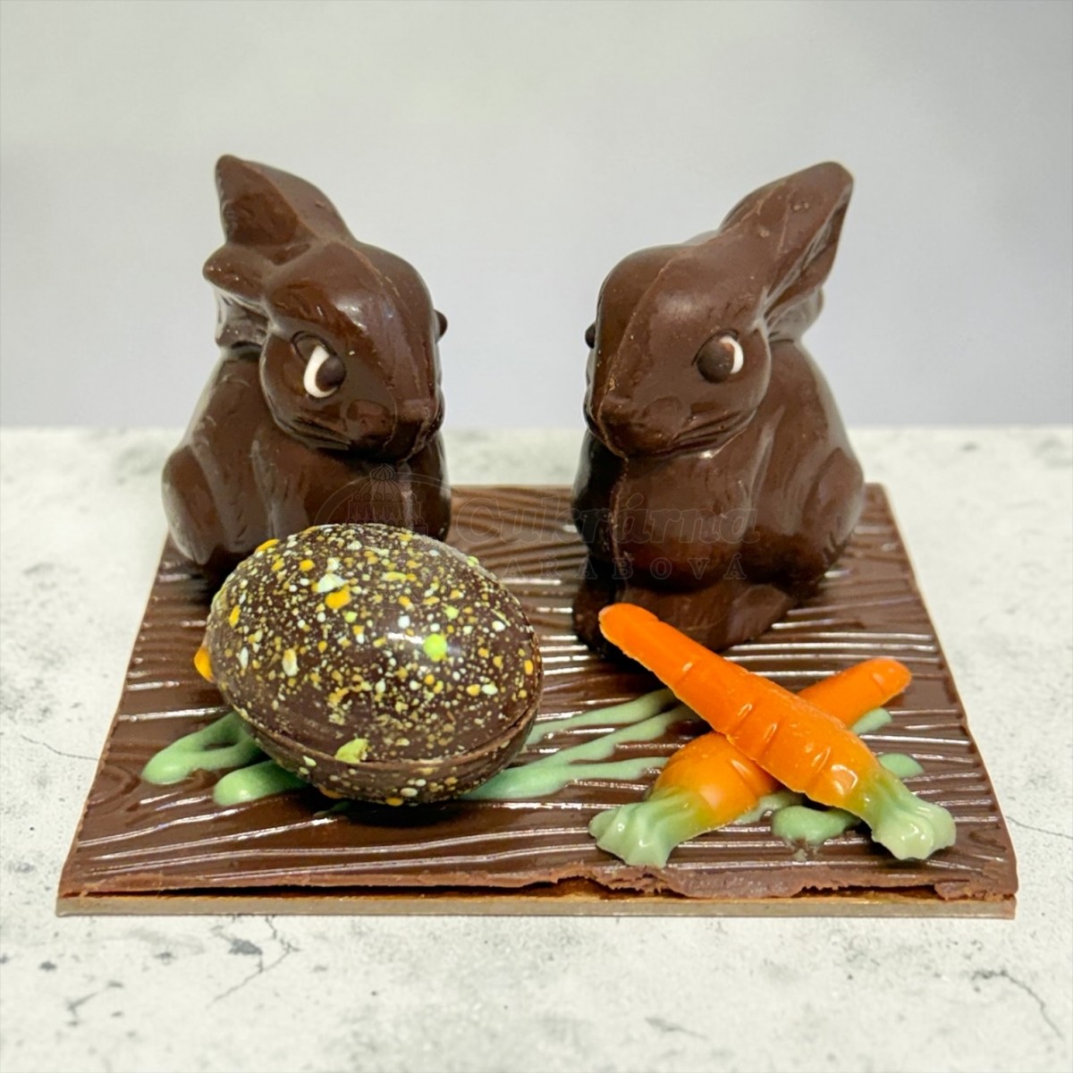 Součástí je také strakaté čokoládové vajíčko a marcipánové mrkvičky, vše naaranžované na čokoládové podložce, která dotváří celý velikonoční motiv.