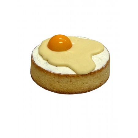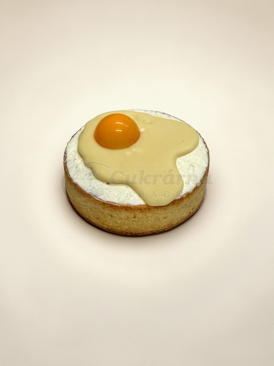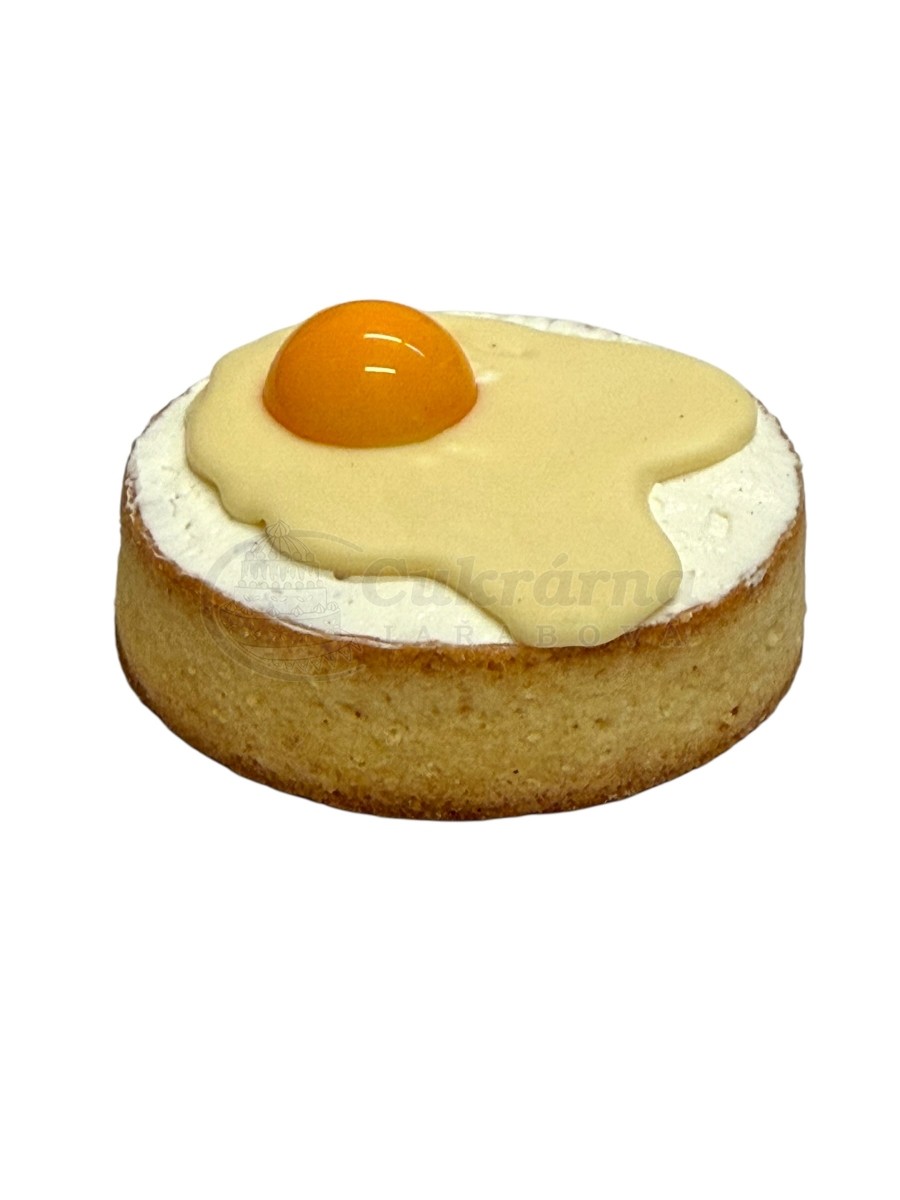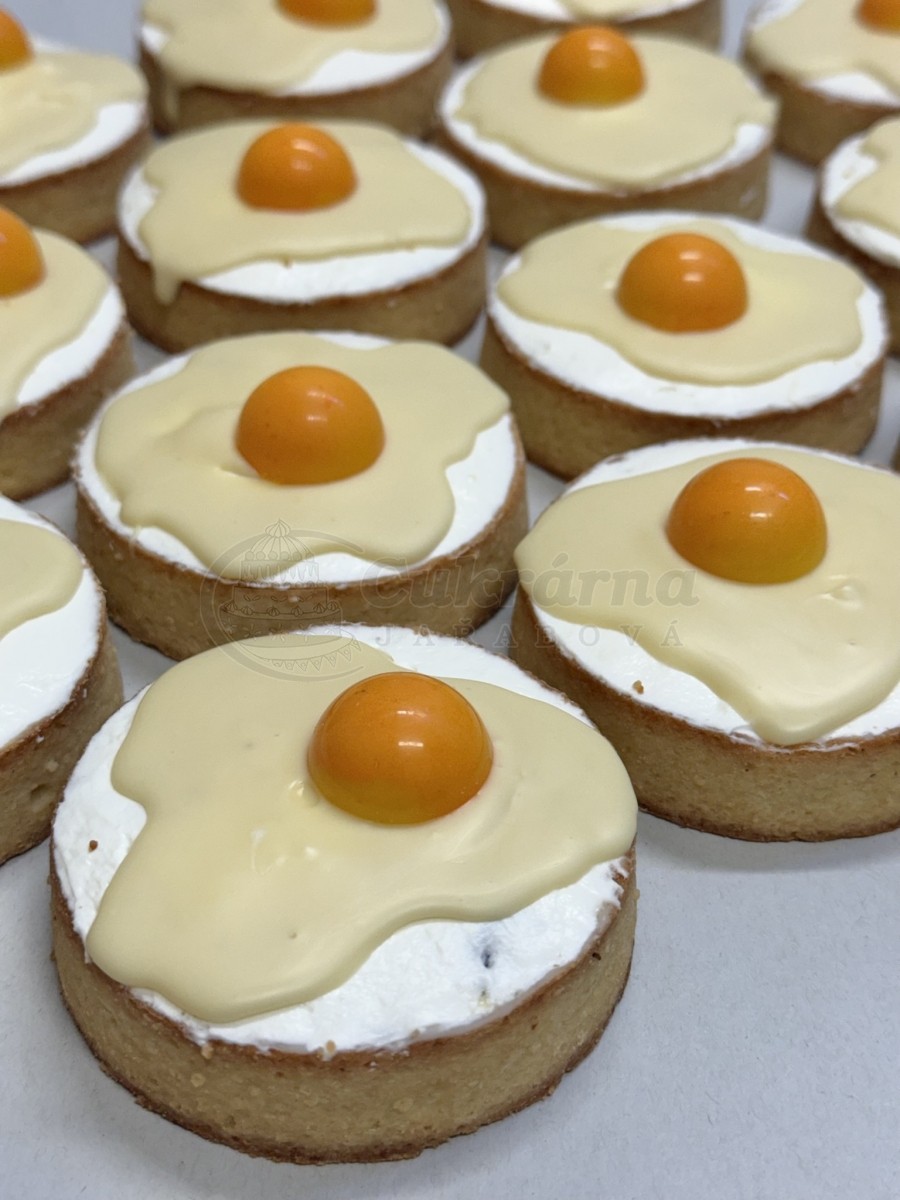 Na povrchu je tartaletka zdobená efektním „volským okem“ z čokolády (pralinka) – bílá čokoláda tvoří jemný „bílek“ a žlutá pralinka připomíná žloutek.